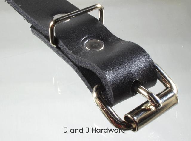 From the monster above to a little petite buckle for lightweight leather as well as "faux leather" and heavier garment material. The slim line roller buckles come in sizes from 1/4 to 3/4 inch in size, making them idea for watch bands, bracelets, and small straps on bags and purses. Shown here with a wire belt keeper , all that is required is the same center hole and holes for rivets, as it is, as well, a heel bar buckle, and all of them are installed the same way.